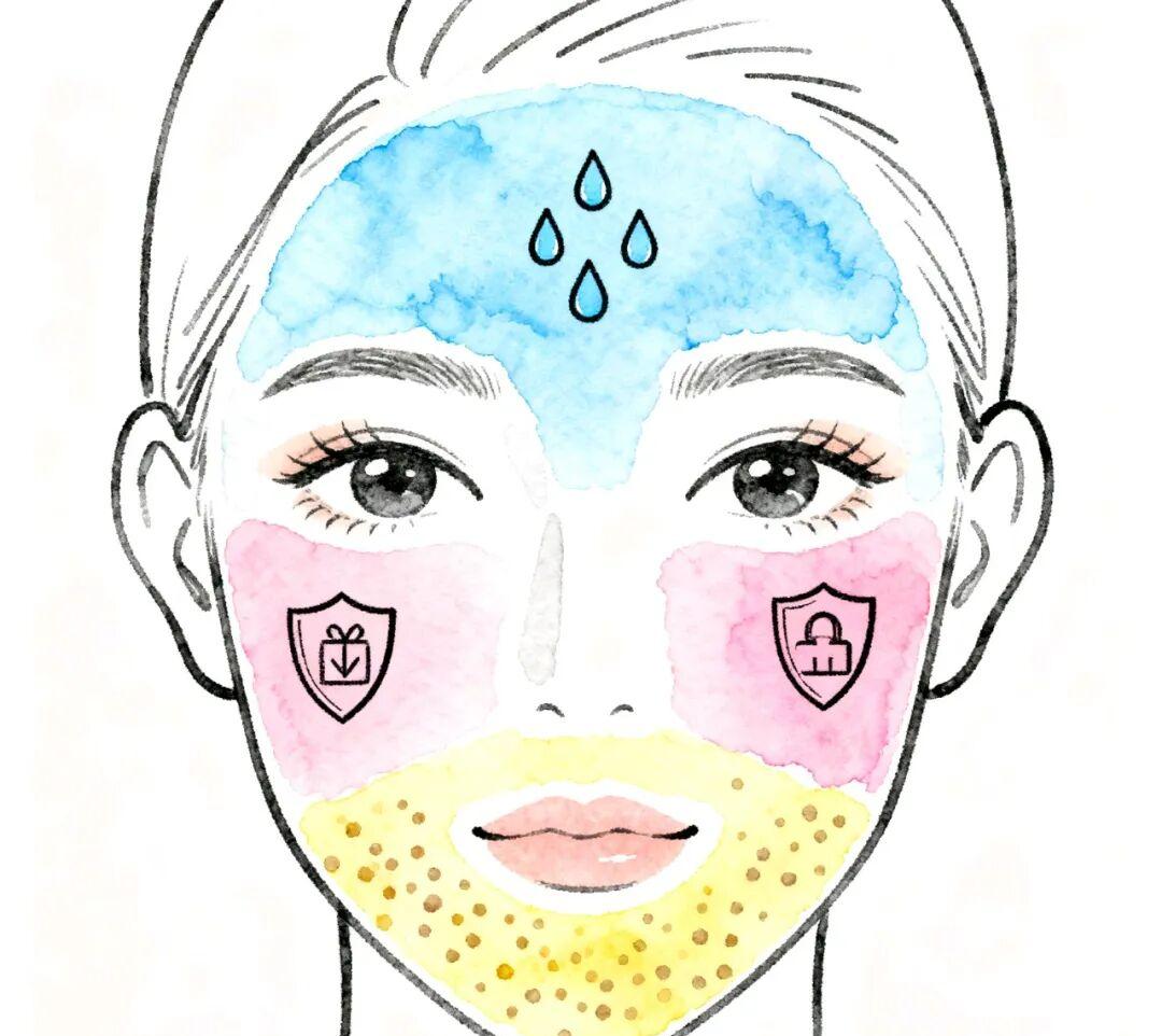 T area (forehead + nose) has dense sebaceous glands and vigorous oil secretion; U area (cheeks + chin) has few sebaceous glands and weak water-locking ability. Climate, stress, and wrong skin care will aggravate this differentiation, leading to the embarrassing situation of "volcano on one side and desert on the other".